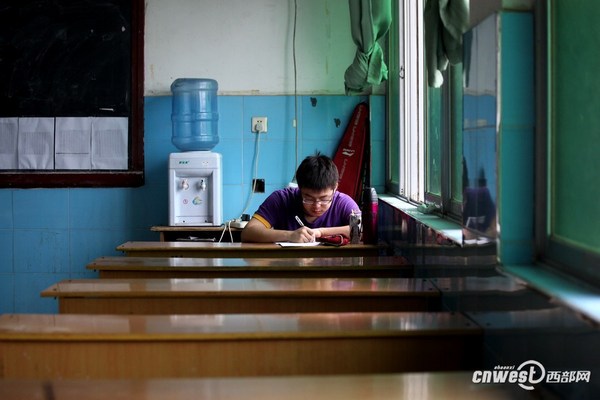 高三教室里,一位正在为高考全力冲刺的学生,独自坐在教室末排学习。