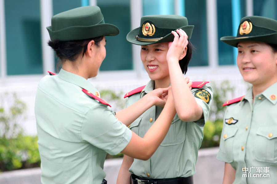 队列训练前,一名班长为一名女兵整理着装。(袁泉 摄)