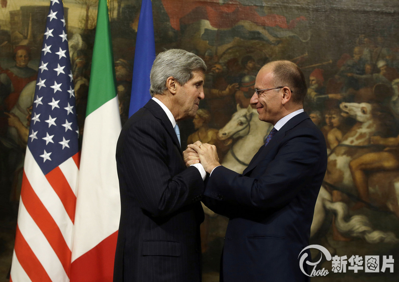 资料图:当地时间2013年10月23日,意大利罗马,意大利总理莱塔在总理府基奇宫迎接美国国务卿克里。图片来源:东方ic