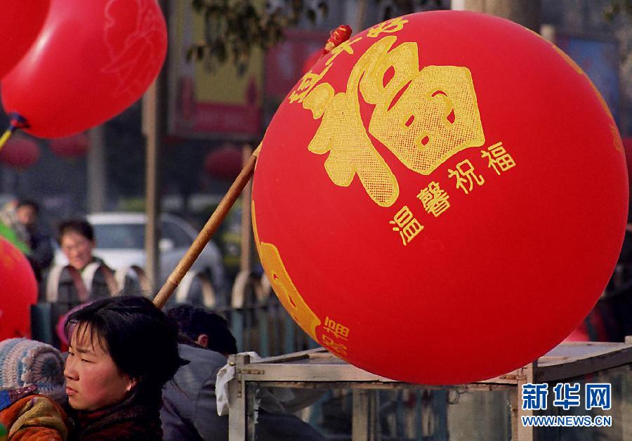 河南郑州一位市民从年货市场上买了一只印有“福”字的大红气球准备回家(2005年1月29日摄)。