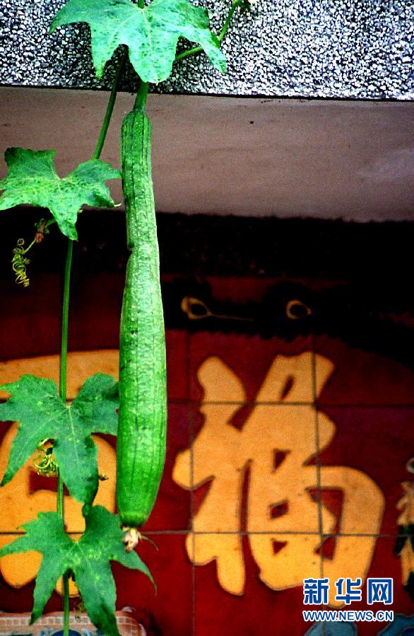 在河南省荥阳市广武镇的一家农户门前,低垂的丝瓜与墙上的“福”字,构成一幅独特的田园小景(2003年6月11日摄)。