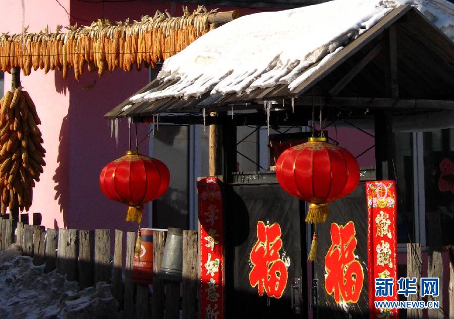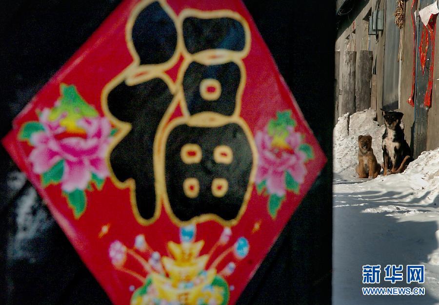 在黑龙江省大海林林业局双峰林场,一家住户的院门上贴着大红“福” 字(2006年2月24日摄)。