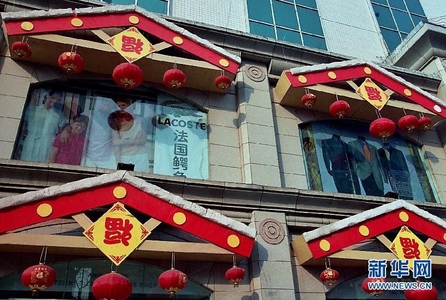 河南郑州一家酒店在春节前用大红“福”字装饰外墙,彰显节日气氛(2005年1月18日摄)。