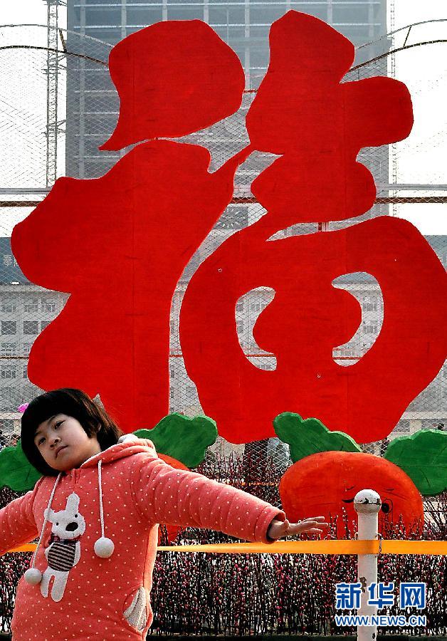 在河南郑州的一个广场上,一名儿童在大红“福”字前留影(2011年2月2日摄)。