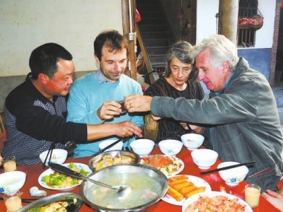 30日,来自法国电视二台的记者夏翁一行到华安拍摄二宜楼风貌,并与土楼居民围炉。福建日报宋清忠蒋欣福摄