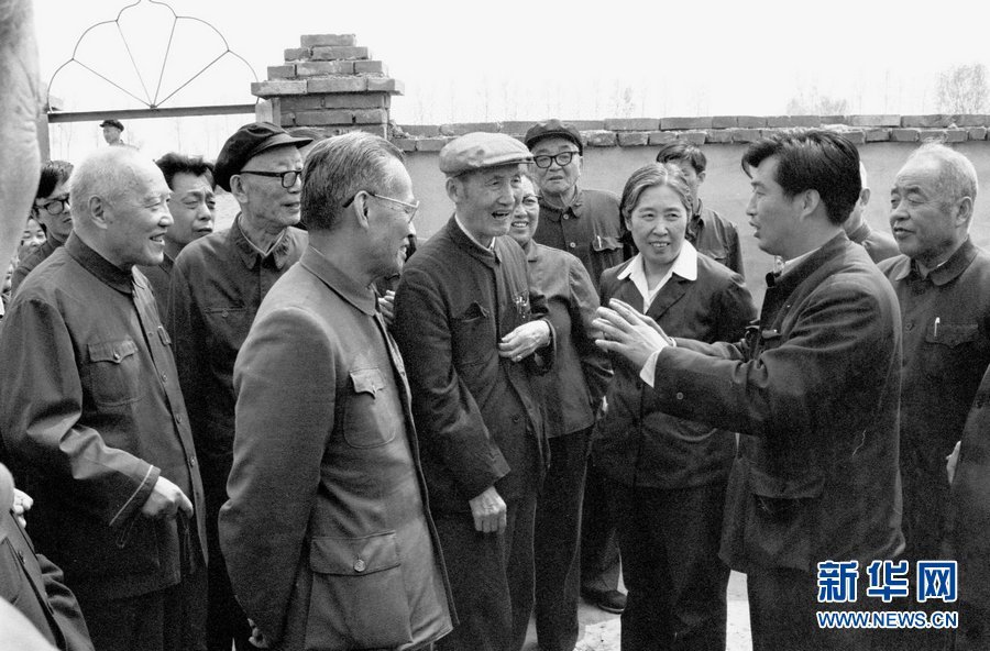 1983年4月,政协全国委员会常委程思远(左前)和委员王光美(右二)等,在视察北京市郊昌平县沙河乡时听取当地负责人介绍情况。(资料照片)
