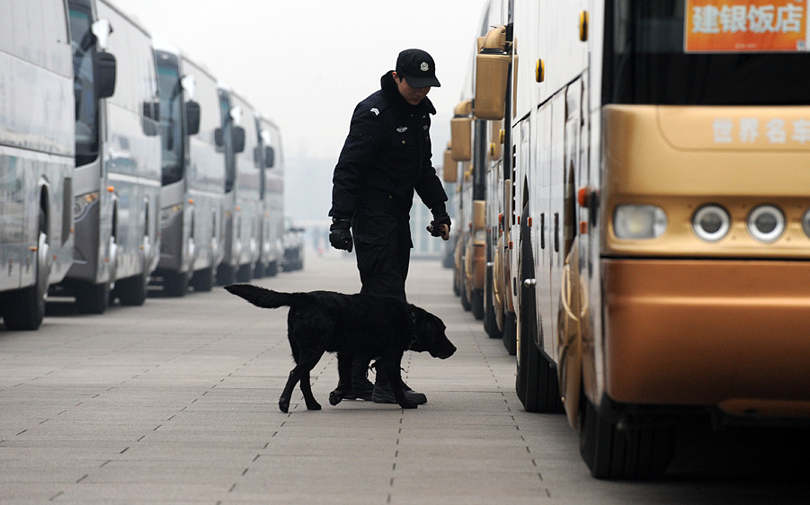 2014年3月3日下午3时,全国政协十二届二次会议在人民大会堂举行开幕会。天安门广场上,一批防爆犬尽职尽责,保两会安全。新华网 陈竞超摄