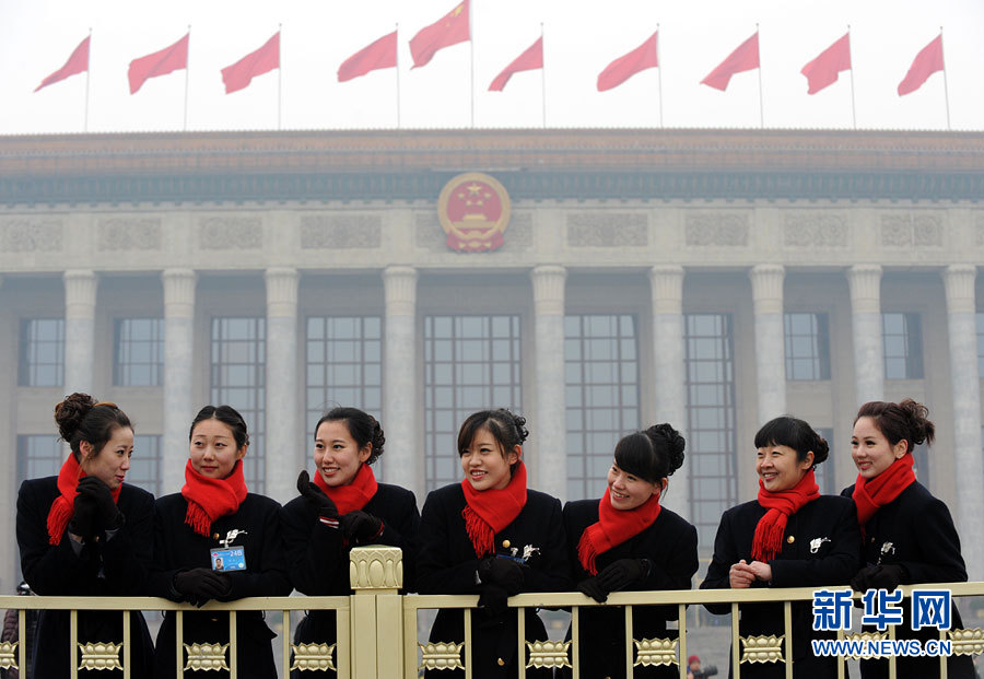 2014年3月3日,全国政协十二届二次会议在人民大会堂举行开幕会。礼宾服务人员成为大会堂外一道靓丽风景。新华网 翟子赫 摄