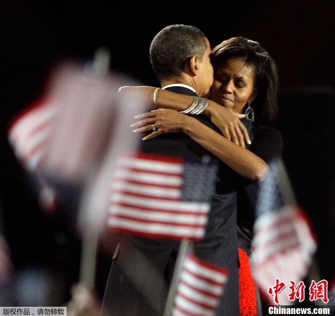 2008年11月4日,奥巴马当选美国总统,在他于芝加哥格兰特公园发表胜选演说后,米歇尔与丈夫拥抱在一起。