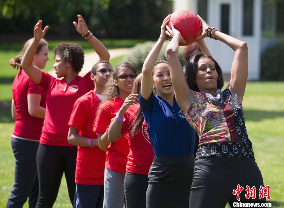 2010年5月9日,米歇尔发起“让我们动起来”的活动,呼吁美国儿童锻炼身体,健康饮食,拒绝儿童肥胖症。图为2011年5月9日,美国华盛顿,米歇尔邀请军人家庭在白宫参加健身活动,并请来华裔冰后关颖珊助阵。