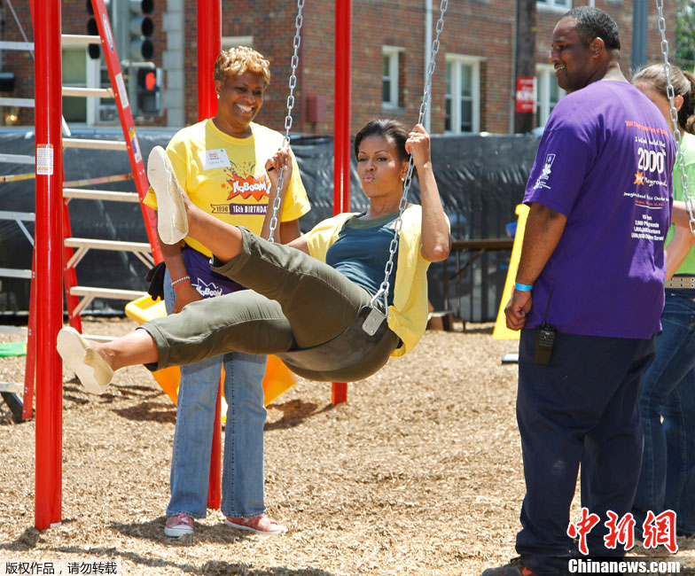 2011年6月15日,美国华盛顿特区,米歇尔与志愿者在一所公立小学协助修建操场。米歇尔心情大好,荡起了秋千。