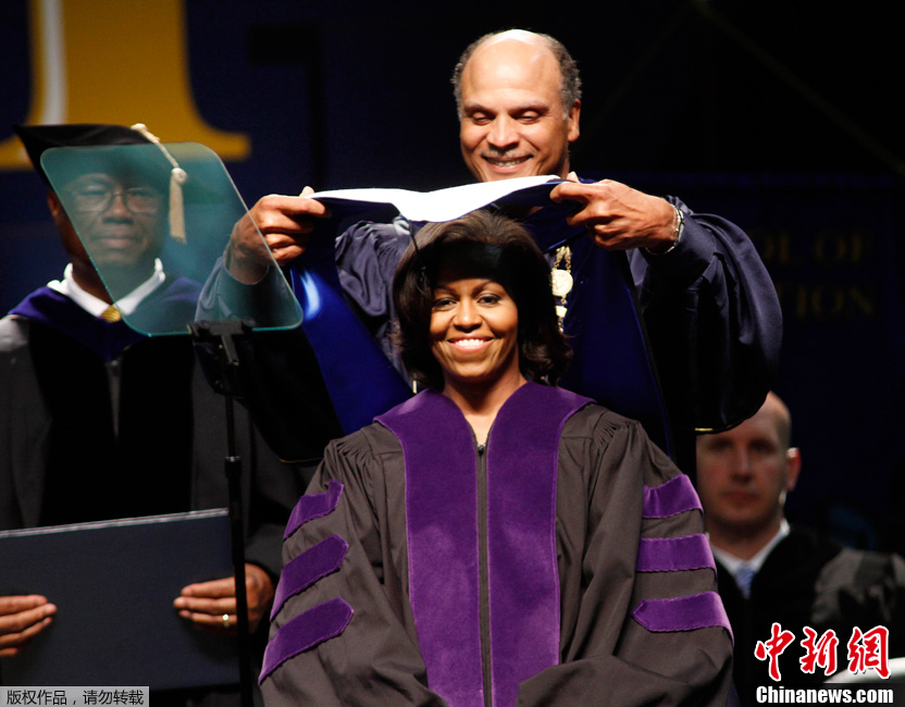 当地时间2012年5月12日,美国格林斯博罗,米歇尔在北卡罗来纳州农业技术州立大学毕业典礼上讲话,米歇尔被授予人文学博士学位。