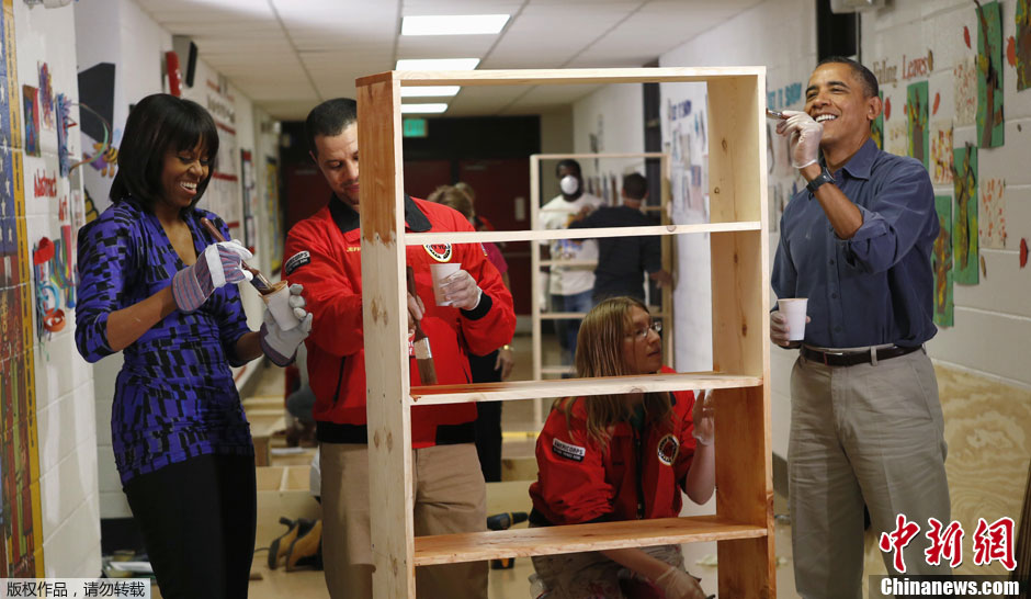 当地时间2013年1月19日,美国华盛顿,奥巴马和米歇尔前往一所小学参加社区活动,一起粉刷书架,号召民众参与纪念“全民服务日”。当日是马丁·路德·金纪念日,也是美国“全民服务日”。