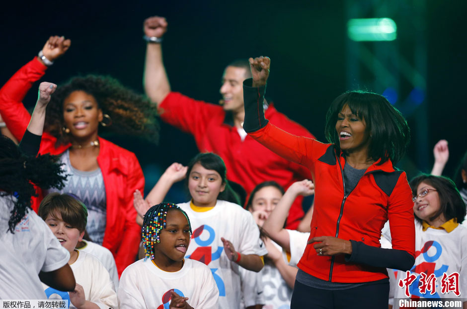 当地时间2013年2月28日,美国芝加哥,米歇尔重回故乡,呼吁学校的学生能够运动起来。据悉,这也是她发起“学生多运动”的三周年纪念活动。图为现场,米歇尔与学生一起跳“骑马舞”。