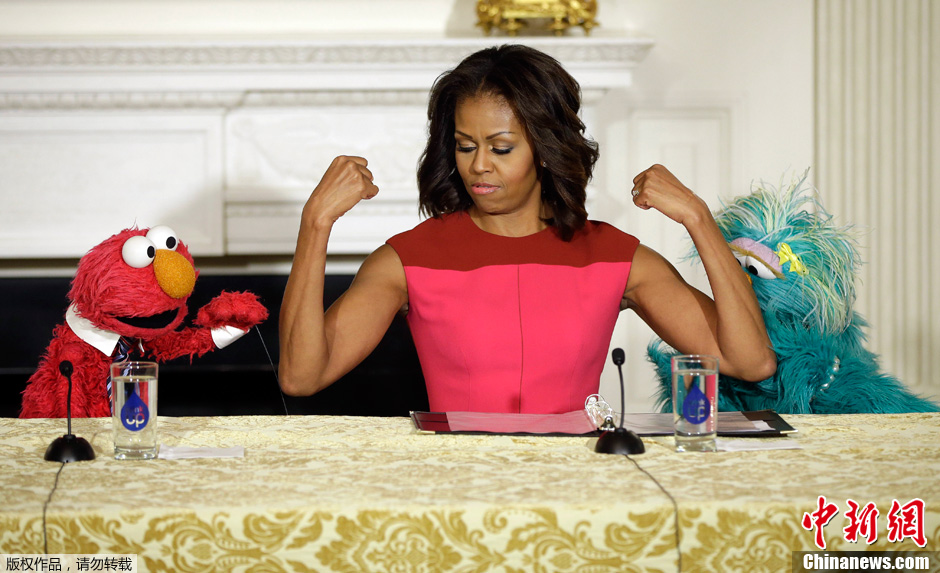 当地时间2013年10月30日,美国华盛顿,米歇尔和来自幼儿教育节目“芝麻街”的两个玩偶一起宣布新一期推动儿童健康饮食的活动开启。活动中,米歇尔亮出了自己的肌肉。《纽约时报》专栏作家莫琳·道曾称赞她的“雕塑般的肱二头肌”:是“现在唯一一个能令人振奋的‘美国力量’的象征符号”。