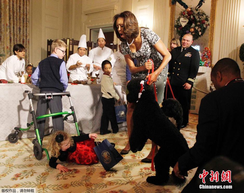 当地时间2013年12月4日,美国华盛顿,米歇尔和军人家庭的孩子们一起参加白宫举办的迎接圣诞节活动。在活动期间,2岁的小萝莉Ashtyn Gardner试图与美国“第一狗”萨尼(Sunny)握手时,不幸被另外一名儿童的学步车绊倒,突然失去平衡倒地,米歇尔随后安慰了跌倒的Ashtyn Gardner。