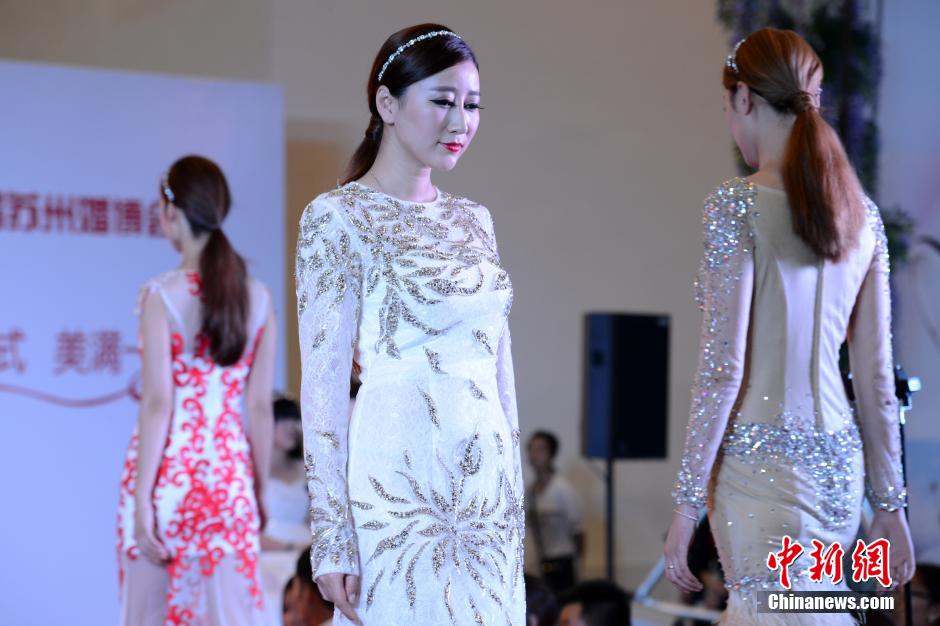 8月23日,美女模特身着靓丽礼服走秀。当日,第九届苏州婚庆文化产业博览会在苏州国际博览中心举行,商家请来美女模特,身着靓丽婚纱礼服,以站台或走秀的方式,聚集各自展台的人气,并打出各种优惠吸引顾客买单。据了解,本届婚博会包含婚纱摄影、婚庆服务等丰富内容,共有百余家各类结婚产业商家参展,为即将迈入婚姻殿堂的新人们提供全方位的一站式婚礼服务平台。周建琳摄