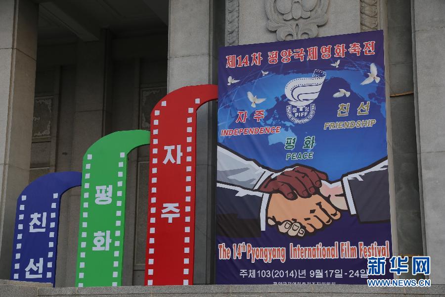 这是9月17日在朝鲜首都平壤拍摄的第十四届平壤国际电影节开幕式现场入口处摆放的宣传板。