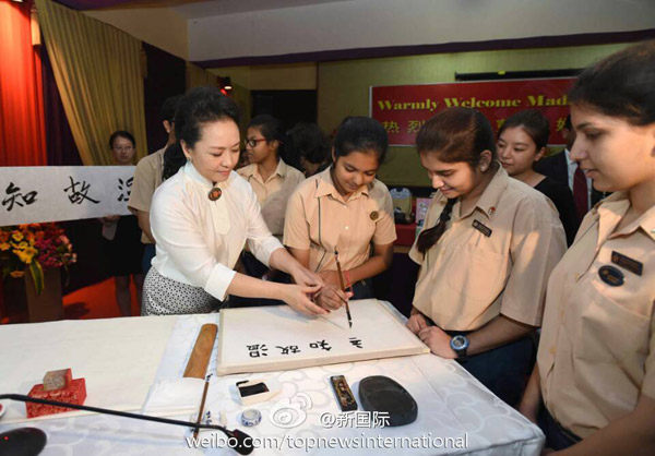 彭丽媛手把手教印度学生练书法:“温故知新”
