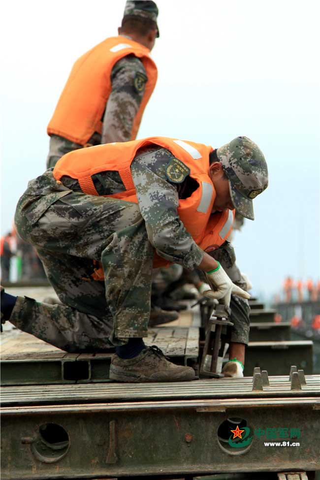 9月21日凌晨6点50分,广州军区某舟桥旅部队拉开了支点长江-2014使命演习的帷幕。此次实兵演习以实战化练兵为背景,该旅坚持全员参战,坚决贯彻军委习主席能打仗,打胜仗的重要指示。江边浪花飞溅,数十分钟,就成功架好600米长的钢铁浮桥。一桥飞架南北、天堑变通途。