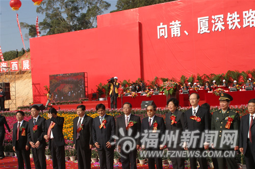 福州新闻网讯 11月23日上午9点,向塘至莆田、厦门至深圳铁路福建段开工仪式动员大会同时在福建莆田、福州、厦门、三明、漳州五个地市隆重举行。在主会场莆田,铁道部刘志军部长、福建省人民政府黄小晶省长共同为工程开工按动启动按钮。