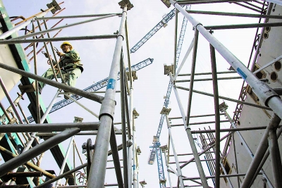 昨日,在宁德核电站二号机组核岛建设工地,工人在浇筑平台前的钢架上作业。自2月份一号机组核岛浇注第一灌混凝土开始,工程进度稳步推进,确保今年完成32亿元的投资目标。(记者 常刚 摄)