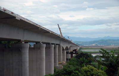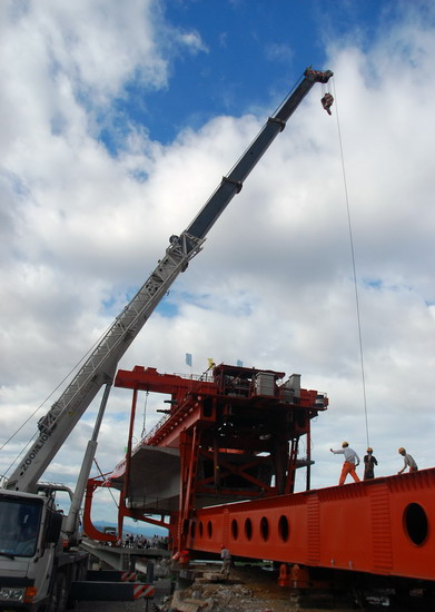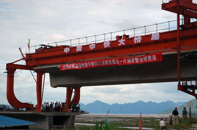 由中铁大桥局承建的温福铁路宁德特大桥的最后一片预制箱梁正在架设中。