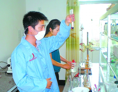 图①:武平县城厢乡下东村的刘鹏前年大学毕业后回到家乡,创办农牧饲料生产企业。通过改装设备、创新配方等手段提高产品科技含量,产品成为市场抢手货,企业年产值达到上亿元。图为近日,刘鹏在实验室对新开发的饲料进行检测。刘耀宝 朱春华 摄