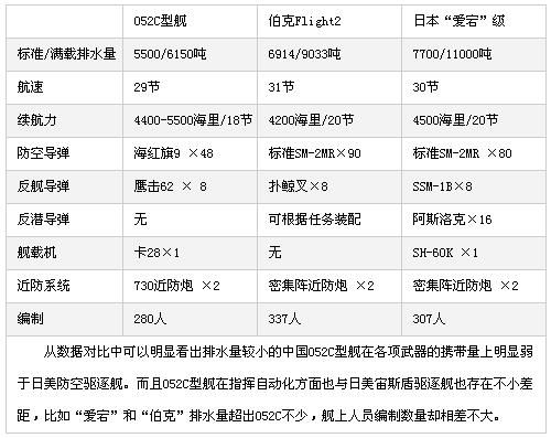 下面是052C型防空导弹驱逐舰与日美主要防空驱逐舰的性能对比: