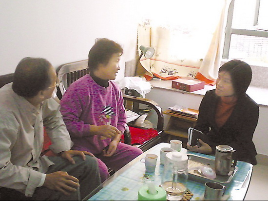厦门天地物业公司工作人员主动上门了解林永春(左一)夫妇的居住情况。(郑璜 摄)