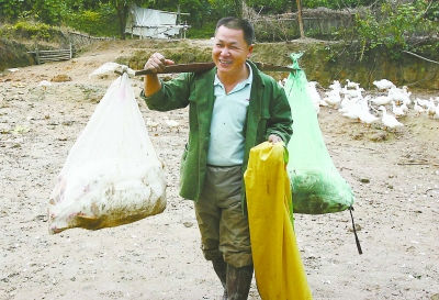 南靖县船场镇西坑村农民肖天池,每天都挑着“健美鸭”到福建土楼旅游景区销售。