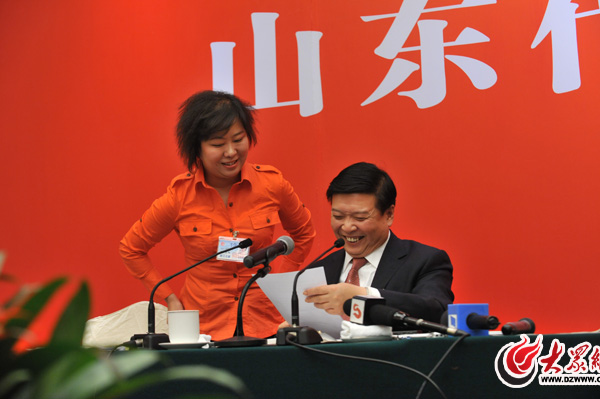 大众网记者将整理好的网友问题现场交到了姜大明手里。见到网友的问题,他欣然接受并十分高兴,立即说:“等会后,我一一回答好吧。”(刘军 摄)