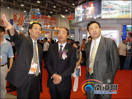 海南省人大副主任在海南展馆前了解项目推介情况(记者 李晓梅 摄)