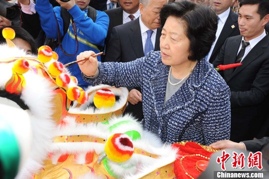 3月31日下午,正在澳门访问的中共福建省委书记孙春兰驱车来到位于路环的澳门妈祖文化村参观,受到澳门闽籍乡亲的热情欢迎。图为孙春兰为龙首点睛。