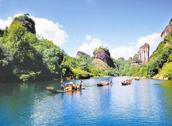 武夷山属典型的丹霞地貌,中国四个世界双遗产地之一。碧水丹山,秀拔奇伟,乘坐古朴的竹筏,遨游于清澈的九曲溪,如同漫步山水画廊,奇幻百出,美不胜收。武夷山自然保护区是地球同纬度面积最大、保存最完整的亚热带森林生态系统,有“蛇的王国、鸟的乐园、昆虫的世界”和“世界生物之窗”、“天然植物园”之称。