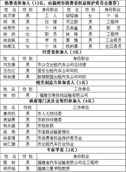 根据《中华人民共和国价格法》、《政府制定价格听证办法》和《政府制定价格听证办法实施细则》,现就福州市区城市客运出租车运价调整听证会有关事项公告如下: 一、时间和地点 时间:2012年9月29日(星期六)上午9:00 地点:于山宾馆二楼多功能厅(福州市于山路10号) 二、参加人名单(见附表) 三、听证人(3名) 黄家华 福州市物价局副局长 林 翔 福州市物价局副调研员 江朝辉 福州市物价局处长 四、听证方案要点 ㈠方案一: 1、起步价:由3公里8元调整为10元,同时取消现行每趟次2元的燃油附加费; 2、车公里租价:由现行每车公里1.5元调整为2元; 3、停车和低速等候费:停车等候或车辆时速低于12公里时,每5分钟按1公里租价,即2元收取; 4、返空费:单程载客超过5公里后,5至10公里按车公里租价的20%,即0.4元收取返空费;超过10公里按车公里租价的50%,即1元收取返空费; 5、夜间加成费(23:00-次日5:00):按车公里租价的20%,即0.4元加收。 ㈡方案二 1、起步价、车公里租价、停车和低速等候费、夜间加成费与方案一相同; 2、返空费:起收返空费里程由5公里调整为8公里。超过8公里按车公里租价的50%,即1元收取返空费。 五、其它事项 为进一步提高政府价格决策的科学性,福州市物价局将于9月13日在福州市物价局网站(http://)设置专栏,广泛征集社会各界对《福州市区城市客运出租车运价调整听证方案》的意见和建议。 特此公告 福州市物价局 二O一二年九月十二日 参加人员表