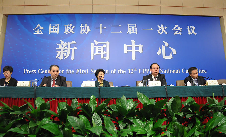3月8日下午3时,全国政协十二届一次会议在梅地亚两会新闻中心二楼多功能厅举行第三场记者会,邀请多位政协委员就“健全社会主义协商民主制度”等相关问题回答中外记者的提问。新华网/中国政府网翟子赫 摄 |