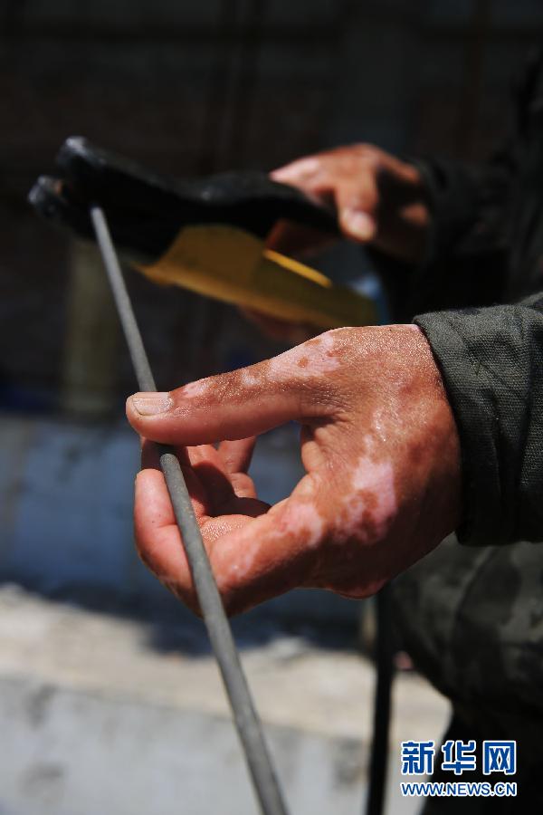 7月8日,江庆涛在江西省九江市庐山区第一中学项目工地上准备焊接作业,手上依然还有烫伤的印记。