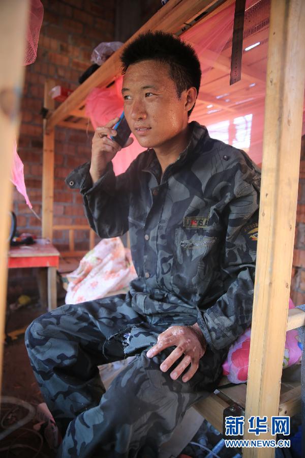 在工作间隙,江庆涛会来到临时搭建的工棚里休息片刻,给远在湖北老家的妻子打个电话。“女儿今年一岁多,等做完这个工程,就回家看看他们。”2013年初,江庆涛成立了属于自己的生态景观工程公司。他说,他的梦想就是把公司做起来,让妻子女儿过上更好的生活。新华社发(张海岩 摄)