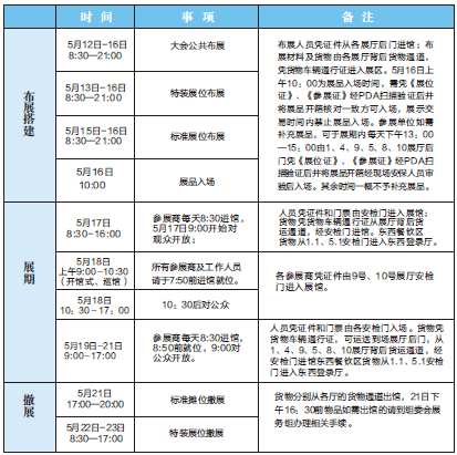 备注: 1、大会期间,参展人员可凭有效证件进入展馆,每天开馆时间为9:00—17:00。其中,5月18日上午暂不对公众开放。 2、参展商凭参展证每天8:30起开始进馆(5月18日上午7:20起进馆)。 3、参展参会人员凭证件由前后安检门进入展馆。 4、5月16日上午10:00-21:00为展品入场时间,所有货物车辆进入展馆需持有货物车辆通行证,并凭《展位证》、《参展证》经PDA扫描验证后并将展品开箱核对一致方可入场,展示交易时间内禁止展品入场。参展单位如需补充展品,可于展期内每天下午13:00—15:00由1、4、9、5、8、10展厅后门凭《展位证》、《参展证》经PDA扫描验证后并将展品开箱经现场安保人员审验后入场。其余时间一概不予补充展品。(餐饮区、美食展区进货时间:上午8:30-9:30,下午4:00-5:00), 5、为确保展会安全,请参展人员自觉遵守展馆治安、消防相关规定,严禁携带易燃易爆品进馆,严禁在展馆内吸烟,注意保管好自己随身携带的手提箱包及贵重物品。 6、所有进馆布展人员需向组委会申请办理布展证(要提供照片),同时向组委会申请施工审批单,展馆需凭组委会的施工审批单通电,布展单位方可施工。 |
