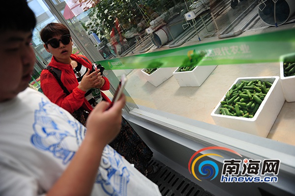 6月29日,“一带一路看海南”全国重点网络媒体海南行采访团在陵水现代农业科技示范基地参观。(南海网记者沙晓峰摄) “黄瓜离地三尺竟然还比在地上的长得快?”“蔬菜原来还可以长在‘摩天轮’上?施肥浇水全部自动化?”当全国重点网络媒体海南行采访团的记者和编辑们来到陵水现代农业科技示范基地时,仿佛一下穿越时空到达未来:温室大棚里的农作物几乎都不长在土地上,传统的浇水、耕地、施肥等工序全部被经科学配比的自动水肥系统取代,瓜果的藤蔓顺着细绳向天空攀爬这一切都让采访团一行啧啧称奇。 据了解,“陵水现代农业科技示范基地”项目总规划面积5231亩,预算总投资17.2亿元,由海南润达现代农业股份有限公司全额投资建设。基地由“五区一带”组成,即科研培训展示区、生产试验区、生产推广区、物流加工交易区、国际论坛交流接待区及休闲观光带。而网媒行采访团所看到的蔬菜“摩天轮”,就是生产试验区里的垂直旋转耕种系统。生产试验区占地371亩,是农业科技成果孵化中心,也是整个示范基地的科技驱动引擎。 “用垂直耕种系统培育出来的蔬果,不仅生长期比普通蔬果短,而且口感也更鲜嫩好吃。示范基地餐厅里的大厨们平时都会用实验区里培育的蔬菜做食材,中央和省领导们来视察的时候尝过都觉得不错。”示范基地有关负责人告诉网媒行采访团的记者们。