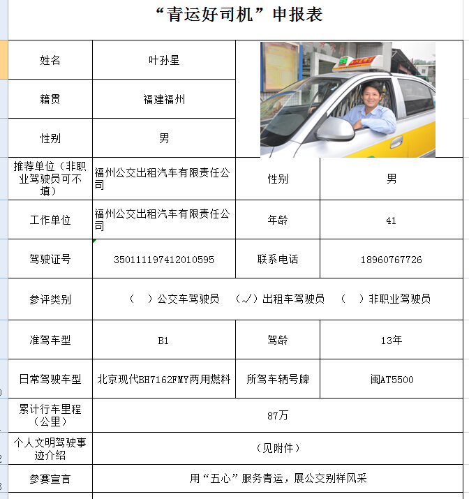福州市“青运好司机”申报材料 闽AT5500叶孙星先进事迹材料 叶孙星同志系福州市公交出租汽车公司闽AT5500出租车驾驶员。从事出租车运营行业多年来,叶孙星一直严格遵守市运管处及公司的各项规章制度,文明行车,诚信经营,规范服务,从未出现任何服务投诉、交通违章及有责交通事故,因工作表现突出、服务优质周到,被评为2011年度福州市文明服务驾驶员、安全行车百万公里无客伤事故客运驾驶员、福州市2012年度十佳驾驶员,在公司多次实现了零投诉、零违章、零事故。所在车组被评为福州市工人先锋号、文明服务五星级车组等荣誉称号。叶师傅的先进事迹先后被福州晚报、东南快报、《城市能见度》等多家媒体宣传报道。 车组成员自觉遵守交通法规,十分熟悉市区路况,对大部分探头都能做到了然于心,不闯红灯,不抢黄灯,不乱加塞,不闯禁行,谨慎驾驶,中速快车,斑马线礼让行人,保障了乘客的出行安全。叶孙星师傅还是个十分热心的人,当他看到其他驾驶员因为发生违章而将好不容易赚到的辛苦钱白白丢掉时,感觉很痛心。他利用班余时间认真收集市区大部分全球眼及电子警察所在的位置,将各种交通标识绘制成图,并将驾驶过程中的节油与爱车技巧毫无保留地精心编制成册进行传授,竭尽所能地帮助同事减少违章与事故的发生。2011年11月,《海峡都市报》及福州电视台等多家媒体报道了此事。 该车组将平时点点滴滴的工作总结成“对待乘客诚心,回答乘客耐心、帮助乘客热心,照顾乘客细心、服务乘客贴心”的“五心”服务法。他坚持做到上车有迎声,下车有送声,用发自内心的微笑,让乘客感受真诚,此为“诚心”;耐心回答乘客特别是外地乘客的问询,做到有问必答,让乘客宾至如归,此为“耐心”;为老、病、残、孕及抱小孩乘客等乘客提供热情周到的服务,主动帮助,此为“热心”;车上常年备着装有针线包、雨衣、呕吐袋等的便民袋以及装有风油精、晕车药、芬必得等的医药箱,以备乘客的不时之需,此为“细心”;树立“乘客为本”的理念,乘客下车时,他总会提醒乘客携带好随身物品,偶尔有乘客不小心将小件物品如手机等滑落到车上时,他总是想方设法尽快联系到乘客并尽量亲自将东西交还到乘客手里,此为“贴心”。2012年新春佳节期间,福州电视台城市能见度栏目报道了叶孙星及李少飞放弃休息,在万家团圆的春节假期依然坚守在工作岗位上,用自己的辛勤劳动为榕城市民的出行提供了便利、优质的服务。 在做好本职工作的同时,他热心地为公司的经营与管理出谋献策,做好“传、帮、带”工作。除了是名出租车驾驶员,可能大家还不知道,叶师傅还是个“老师”,在新进驾驶员的培训课上,总能看到一群驾驶员围着一位穿着工作服的老师问问题,他就是叶孙星师傅,每次课上他都细心地向大家讲解规范行车、避免事故、对待乘客投诉等注意事项,并耐心地回答驾驶员的问题。由于他的对班司机也是名新驾驶员,为了帮助对班提升业务素质,他还专门写了自己多年的行车经验和开车技巧送给对班。 在做好本职工作的同时,他还积极服务 “5.18”、“6.18”等大型社会经济、政治活动。积极参加公司组织各项社会公益活动,清明节免费接送天新公益园的残障儿童前往祭扫烈士陵园,六一节为市儿童福利院孤残儿童“献爱心”、“高考直通车”免费运送考生赴考场、“温州谢谢您”感恩之行、及夏日送清凉志愿者活动等社会公益活动,他以自身的实际行动,积极维护出租车行业文明窗口形象。 |
