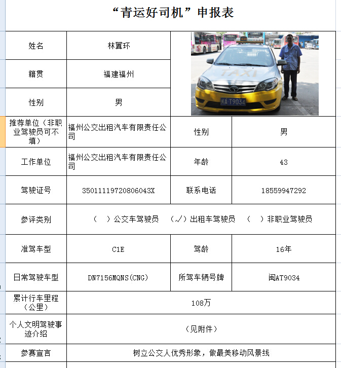 福州市“青运好司机”申报材料 闽AT9034林翼环先进事迹材料 林翼环同志系福州市公交出租汽车公司闽AT9034出租车驾驶员。入司以来,他严格要求自已,遵守市运管处及公司的各项规章制度,文明行车,诚信经营,规范服务,在各项文明创建活动中起到表率、带头作用,因工作表现突出、服务优质周到,得到了乘客及公司领导的认可。 每一辆出租车都是一个流动的“城市窗口”,一个城市的形象。为了乘客的出行安全,他时常提醒自己“乘客安全无小事,时时处处要留心”,平时注重车辆的维护、检查与例行保养,一旦出现故障就立即维护,力所能及的,他自己动手处理,不能自己排除的尽快开回公司修理。他还认真做好进站保洁工作,从不开脏车、病车出场,他坚持“三天进站”进行保洁,确保车容车貌车况良好,车内整洁、无异味,维护好“城市窗口”的形象。 在优质服务方面,他以满腔的热忱与高度的责任感为广大乘客服务,把工作的标准定位在“一切为了乘客”这一坐标上,严格按照公司的规定做好规范着装、礼貌用语、微笑服务。耐心回答乘客特别是外地乘客的问询,根据乘客的需要介绍当地的名胜古迹或风土人情;主动照顾老、弱、病、残、孕及抱小孩乘客,尽心竭力为他们提供力所能及的方便与帮助。同时,林师傅还是个热心人。2014年一天,林师傅载到一位老人要去医院办急事,到达目的地后,老人发现身上钱带的不够,林师傅见老人神情焦急应该是出门忘了,便安抚老人说没关系,没关系,赶快去忙你的事情吧。这样的事情还很多,林师傅说遇到老人坐车他都会少收或者不收钱,他觉得这些都是自己应该做的。 除此之外,他还十分积极服务“5.18”、“6.18”、国际医疗博览会、全国文明城市迎检保障等,他以热情周到的服务,给乘客留下了良好的印象,他认为只要保持良好的心态,遵章守纪,按规范经营,再难的制度都不是约束。也只有这样才能做好自己的本职工作,给公司增光,给乘客留下好印象。 |