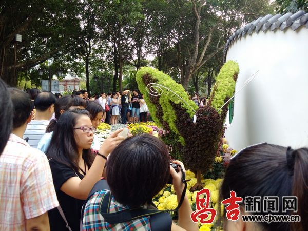 图为在西湖公园入口处合影的市民。昌吉新闻网记者 刘辉摄 福建省第五届菊花展福州展区暨西湖公园第48届菊花展共展出近千个品种(其中精品菊花100多种)、近7万盆菊花。这可是历届西湖菊展中规模最大、品种最多的一次。