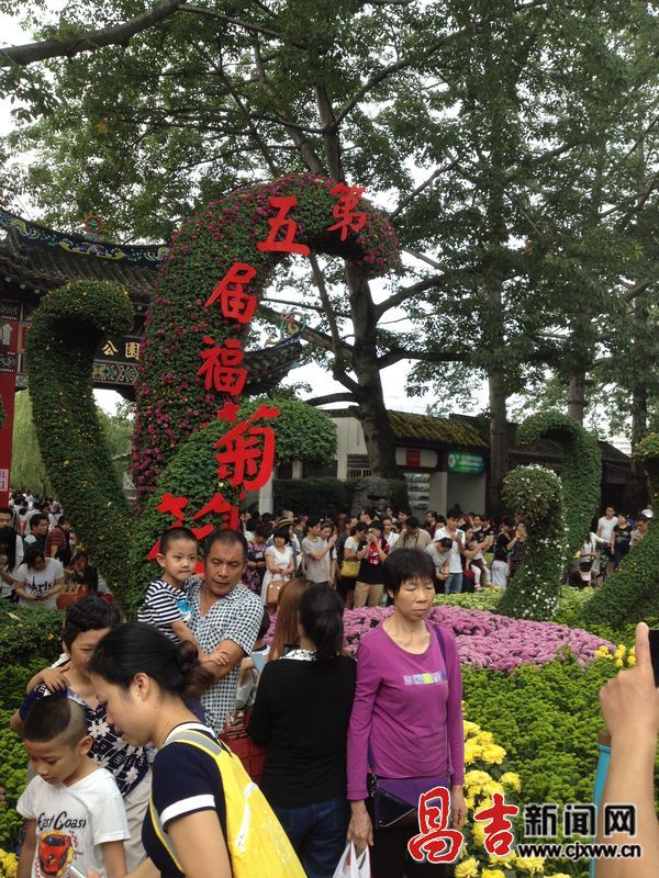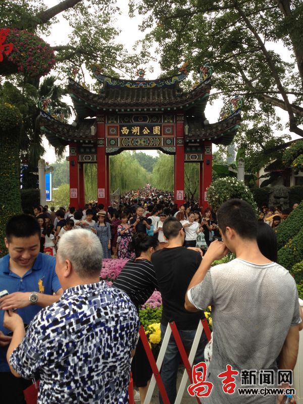 图为西湖公园入口处,人山人海。昌吉新闻网记者 刘辉摄 福建省第五届菊花展开幕后的首个周末,11月8日,前来观赏菊花的福州市民挤爆了西湖公园。