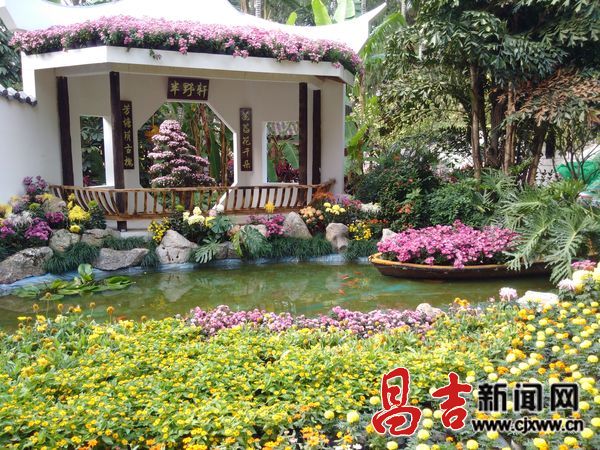本届菊展,通过构建三角亭、钓鲈桥、水榭等半野轩的园林元素,并融入白墙灰檐、飞檐翘角等本土符号,在西湖公园的开化屿重现“半野菊园”景观。