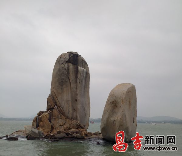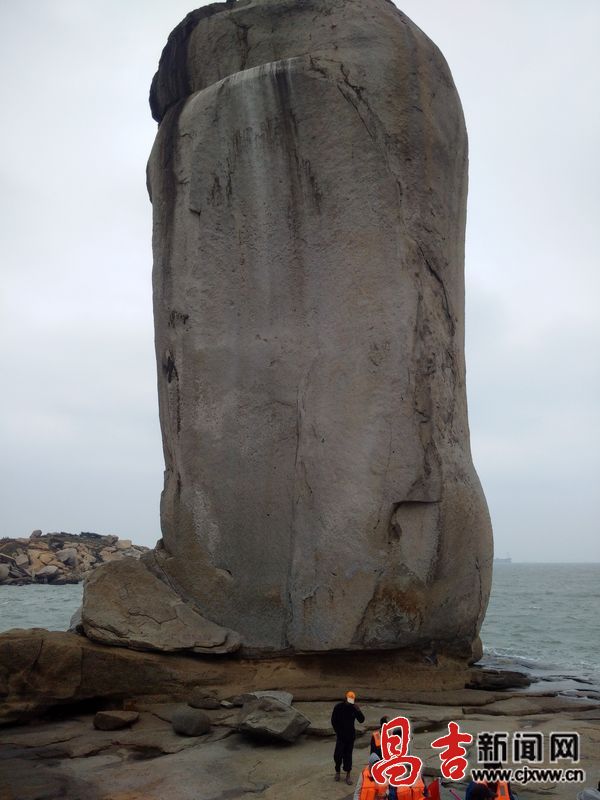 从看澳村岸边坐渡船,十几分钟就到达礁石上,礁石底部是一组平坦完整的岩石。两个石柱均由粗粒灰白色的花岗岩组成,东侧的一个高达33米,胸宽9米,厚8米,周长57米;西侧的一个高17米,胸宽15米,厚8米周长39.9米。两个石柱的底部都是近似四方形体,直立在礁石上。据地质学家考证是世界上最大的花岗岩球状风化海蚀柱。 |