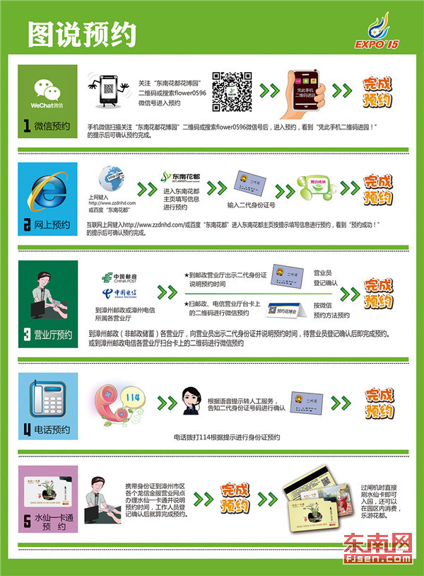 (图6各种预约免费入园方式解说图) 最创意——线上线下办花博 来花博园怎么走,到花博园看什么,玩什么,为了让游客能够轻松玩转花博园,将推出“掌上花博”,在微信平台上建立另一个花博盛宴,通过微信平台、手机终端结合地理定位,将传统会展与互联网融合,实现花博会线上线下的立体推广。让游客们在未进入景区前就能通过平台了解整个展会及所有参展商品的布局,领略室外展园的风姿倩影,还能获取园区导览、导购、参展产品、现场活动和现场服务等相关展会信息,第一时间掌握展会吃、住、行、娱、购最新动态,为游园带来更多便利。 最便民——wifi全覆盖 停车场扩容 美景美食怎能不发朋友圈分享,不用担心手机流量不够用,花博会期间,园区将实现全面WiFi覆盖,游客只需关注东南花都官方微信服务号,无需密码,便可在园区免费上网。对于自驾游游客,除了主大门停车场和芙蓉园停车场外,今年景观桥桥临时停车场在去年80亩的基础上扩至140亩,可容纳近2250辆车,满足更多游客的停车需求。考虑到搭乘公交出行的游客较多,今年对花博园公交站台候车处进行提升改造,延长了公交候车亭,并开辟了候车区通往园区西侧的卫生间,为市民提供了良好的候车环境。 |