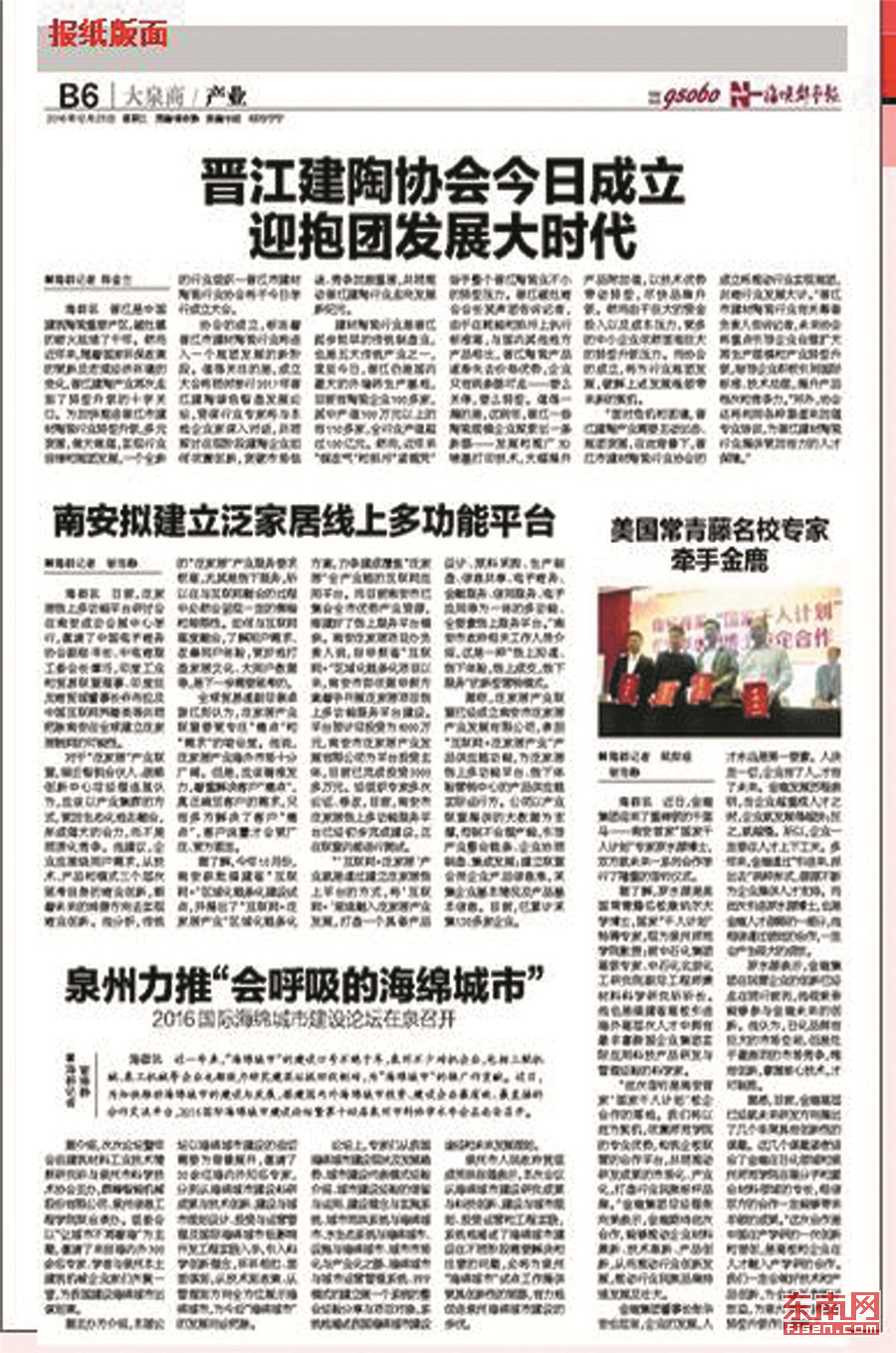 王春金在署名文章《侨乡南安抱团走进“一带一路”》中提到,在综合研判宏观形势、深挖国家战略内涵、分析自身比较优势的基础上,南安作出了打造泛家居产业联盟,推动建材家居产业抱团“走出去”的决策,并对原因展开了分析。王春金表示:“我们将继续深入挖掘‘一带一路’倡议机遇,探索泛家居发展模式,进一步打响南安泛家居区域品牌,更好地助推产业加快转型升级、创新变革,推动‘南安制造’向‘南安智造’跃升,努力把泛家居产业培育成为经济发展的一个亮点和新的增长点,为建设机制活、产业优、百姓富、生态美的现代化新南安注入新的更大的动力。” 林荣忠在署名文章《打造南安“泛家居”产业联盟》中说,整合资源,加快打造泛家居产业联盟,具体是按照“政府主导、企业主体;市场运作、跨界联盟;两端融合、集成体验;机制灵活、保障有力;立足国内、面向世界”的发展思路,将石材、水暖洁具、厨卫、石材工艺摆设、家具搭配以及物流配送、电商平台等各个环节进行融合互动,通过设计创新引领、产业抱团联盟、渠道整合拓展、模式创新提升、线上线下结合,推广“政府+联盟+公司”的南安“泛家居”产业联盟及体验营销新模式,提供“厂家直销、一站式采购、一体化服务、个性化定制”的新型家装解决方案,以此引领消费、升级消费、创造消费。 南安两大主官的署名文章,让所有人都看到南安打造泛家居产业联盟的决心。各大媒体纷纷来到南安,采访政府相关负责人、企业大咖、业内人士等,多角度剖析泛家居产业模式。《南安探索“泛家居”行业抱团发展 新模式推进供给侧改革》《跨界联盟,“泛家居航母”破冰前行》《南安泛家居产业联盟助力产业转型》等新闻相继出现在各大媒体。 2016年石博会,泛家居成为盛会亮点,再次成为各大媒体的焦点:《首届海丝泛家居主题周 构建海内外朋友圈》《海丝泛家居活动周为石博会添彩》《南安泛家居家装节昨开幕 品牌联盟引爆欢乐购》…… |