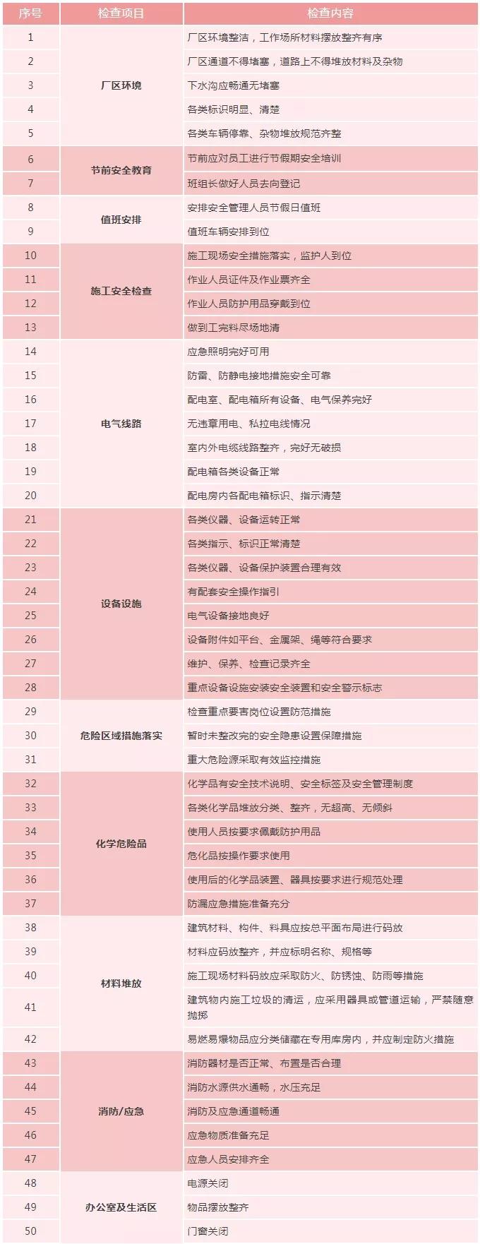 2020年春节即将来临,越是归心似箭 越要绷紧安全弦!企业如何确保节日期间的安全?生活中又有哪些需要警惕的风险? 这份节前安全教育培训关乎我们每个人,一定要仔细阅读! 节前安全检查表 80项! 为确保节日期间的安全及节后复工复产能平稳有序进行,节前的安全检查千万要高度重视!节前,职工思想比较活跃,精力容易分散,是生产事故的易发期和敏感期,要牢固树立“以人为本,安全第一”的思想,本着“先安全后生产,不安全不生产”的原则,认真做好安全检查和员工节前安全教育工作。加强安全生产检查,防止违章行为发生,确保安全生产受控。